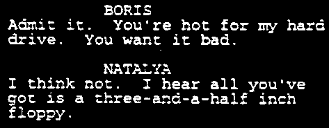 We've read the original script to GoldenEye and it was better than we expected. Here is one of our favorite pieces of dialogue, an exchange between Natalya and Boris, that does not appear in the film.
