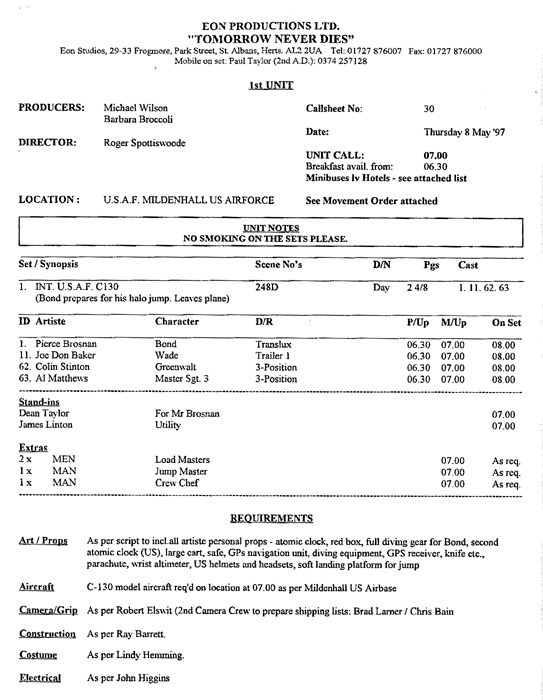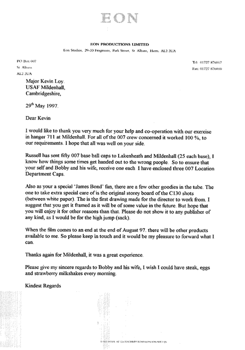Major Kevin T. Loy, a member of the U.S. Air Force, is stationed at the Royal Air Force base at Mildenhall. He had the opportunity to work on a scene in the forthcoming Tomorrow Never Dies on 8 May 1997, and he kindly shares his experiences with other Bond fans...